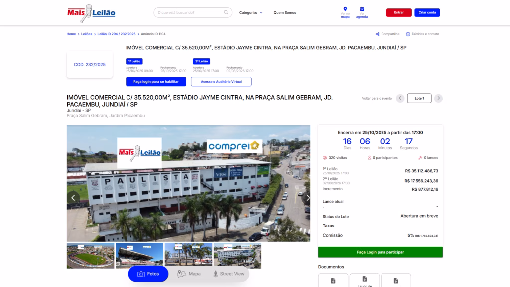 O Estádio Doutor Jayme Cintra, casa do Paulista Futebol Clube e um marco histórico de Jundiaí, está sendo leiloado mais uma vez. A oferta foi publicada no site Mais Leilão, com lance inicial de R$ 35.112.486,73. O leilão se encerra no dia 25 de outubro, às 17h, e até o momento não registrou lances.